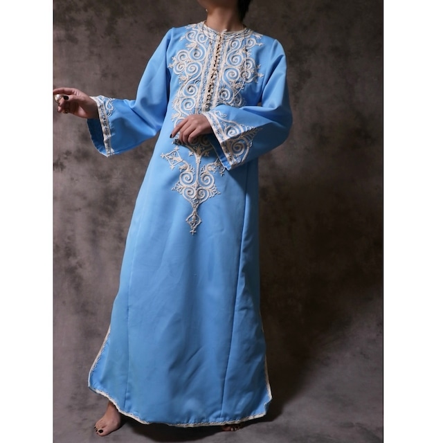 ヴィンテージエジプトカフタンドレス。 珍しい配色!!! とても綺麗な水色にオフホワイトの贅沢なブレードデザインが最高すぎます。。。 カフタンドレスらしいボタンもいいし、シルエットもとても綺麗で存在感抜群、、、!! ウエスト切り替えがないので着心地もすごく楽ちんで、主役になってくれるアイテムです モデル身長163cm 〈サイズ〉 肩幅36cm、袖丈56cm、身幅47cm、着丈136cm 〈素材〉 恐らくポリエステル混紡 〈コンディション〉 バック裾に汚れがございます。 気になる点がございましたらお気軽にお問い合わせ下さい。 基本的に返品交換はおこなっておりません。 ビンテージにご理解がある方のご購入をお願いいたします。