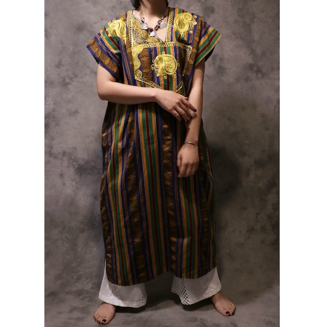 ヴィンテージ エチオピア刺繍ドレス エチオピアらしい刺繍が◎◎ モモンガみたいなシルエットも可愛いし、エチオピアのドレスでは比較的珍しいデザインな気がします、、、! しかも落ち着いた色味のオールハンドステッチ 本当にすごい。。。 縁にまで刺繍 めちゃめちゃ手間かかってます、、、 柔らかい生地の肌触りも◎ 涼しく楽に着れます◎◎ モデル身長163cm 〈サイズ〉 身幅51cm、袖丈29cm(首元から採寸)、着丈127cm 〈素材〉 恐らくコットン 〈コンディション〉 薄らシミはございますが、大きく目立つことはないかと思います。 気になる点がございましたらお気軽にお問い合わせ下さい。 基本的に返品交換はおこなっておりません。 ビンテージにご理解がある方のご購入をお願いいたします。