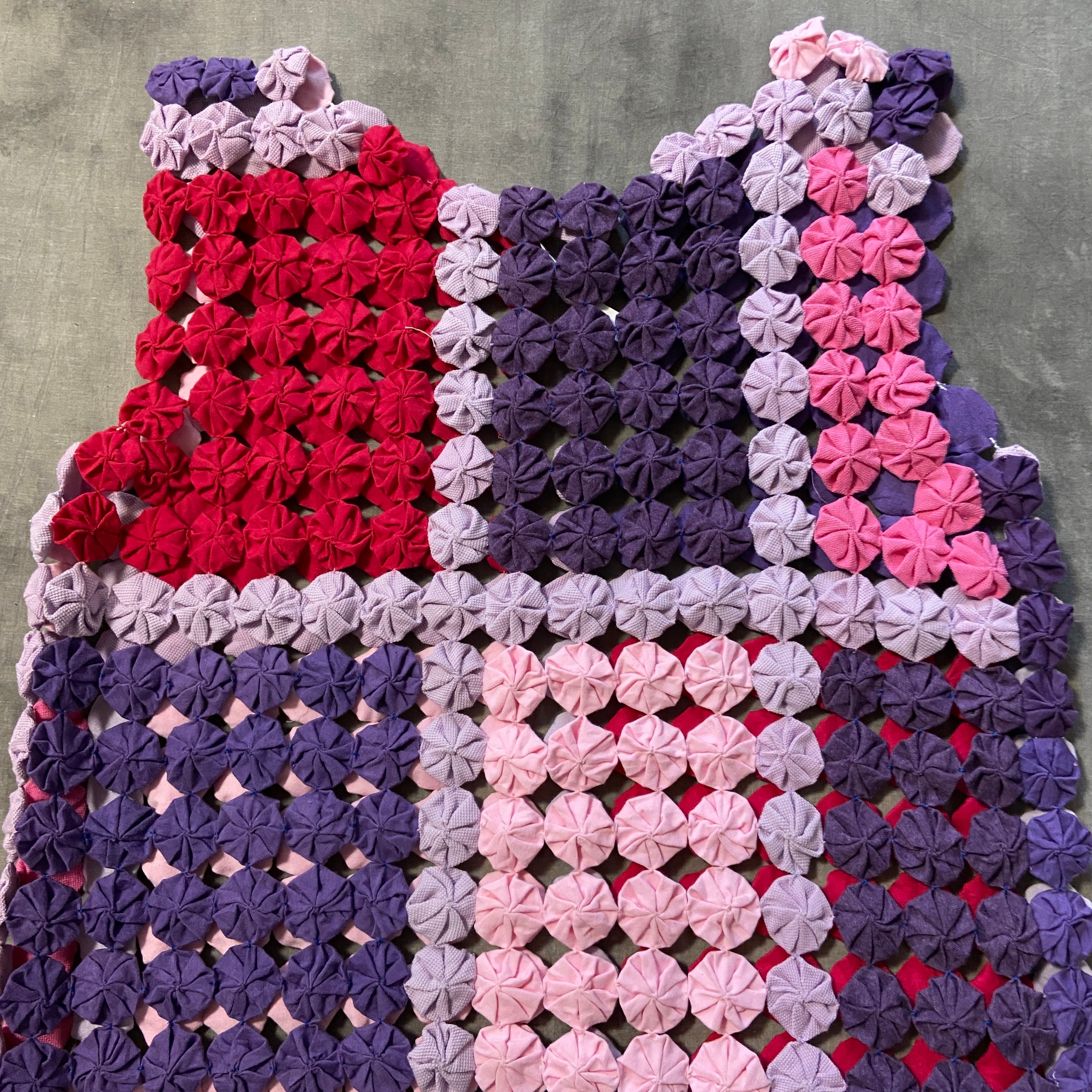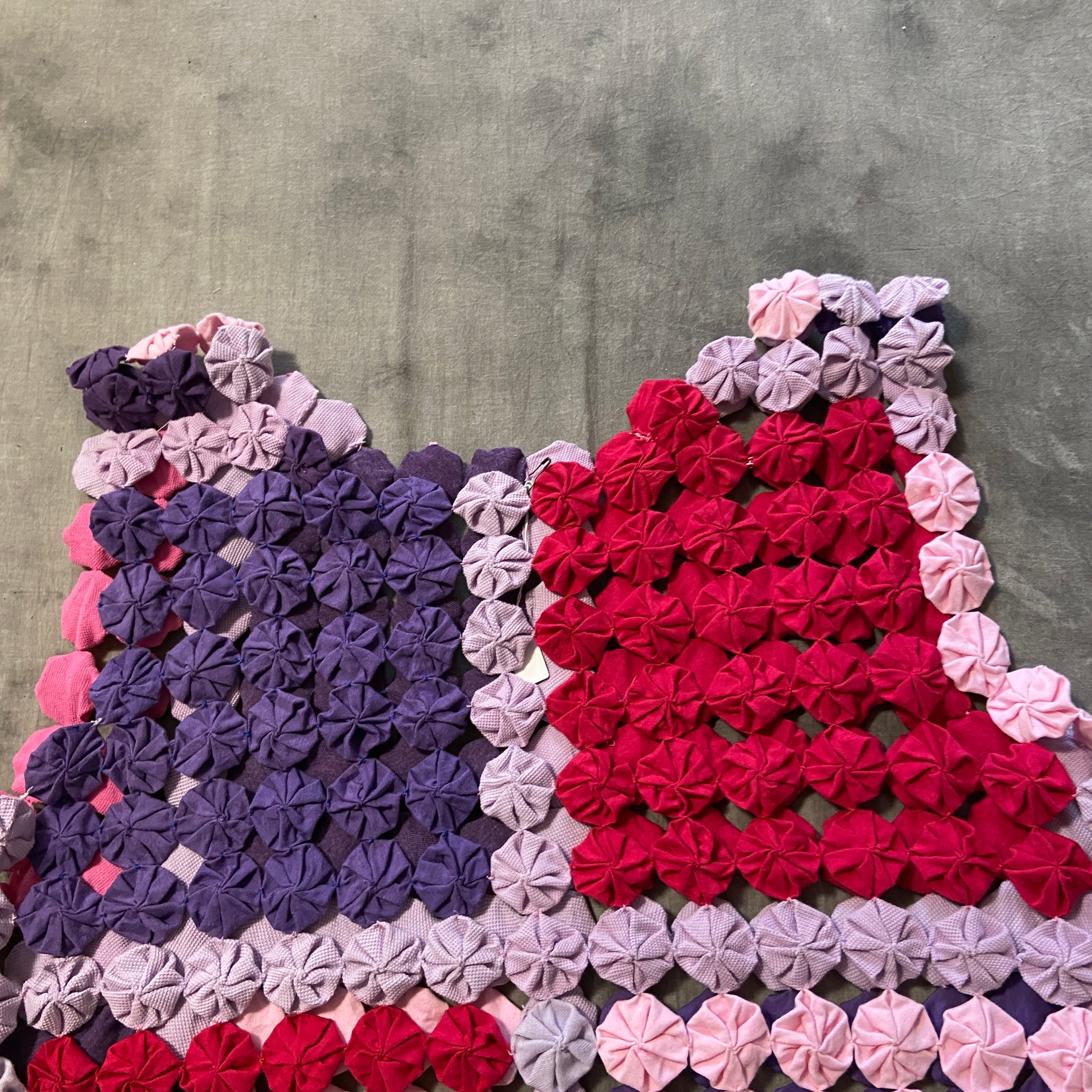 細かな生地を一つ一つ絞ってつなげたヨーヨーキルト
