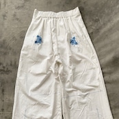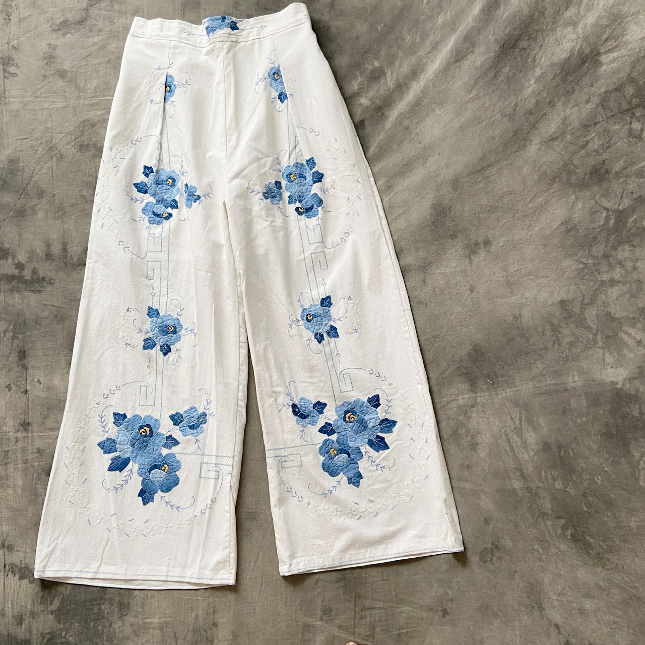 元々は違う形で使われていた美しい生地使ってリメイクされたパンツ