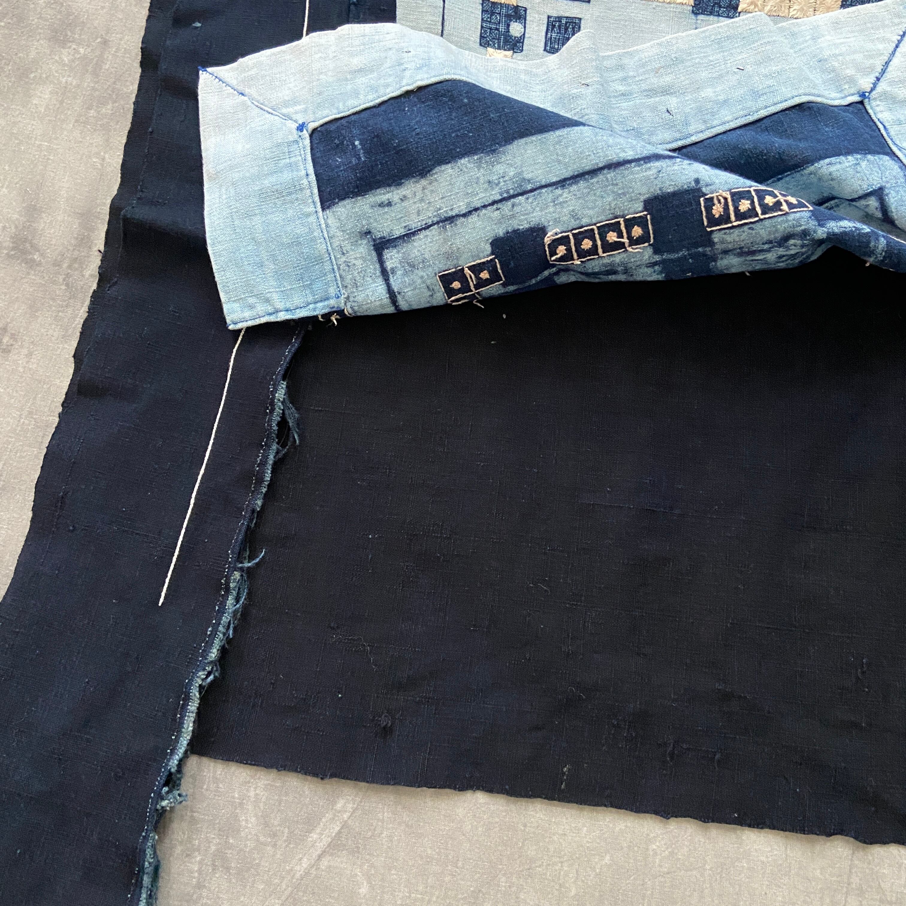 何日もかけて染められた深い藍染のボディ、とんでもなく細かいろうけつ染めと手刺繍は見れば見るほど引き込まれていくような圧巻の手仕事。