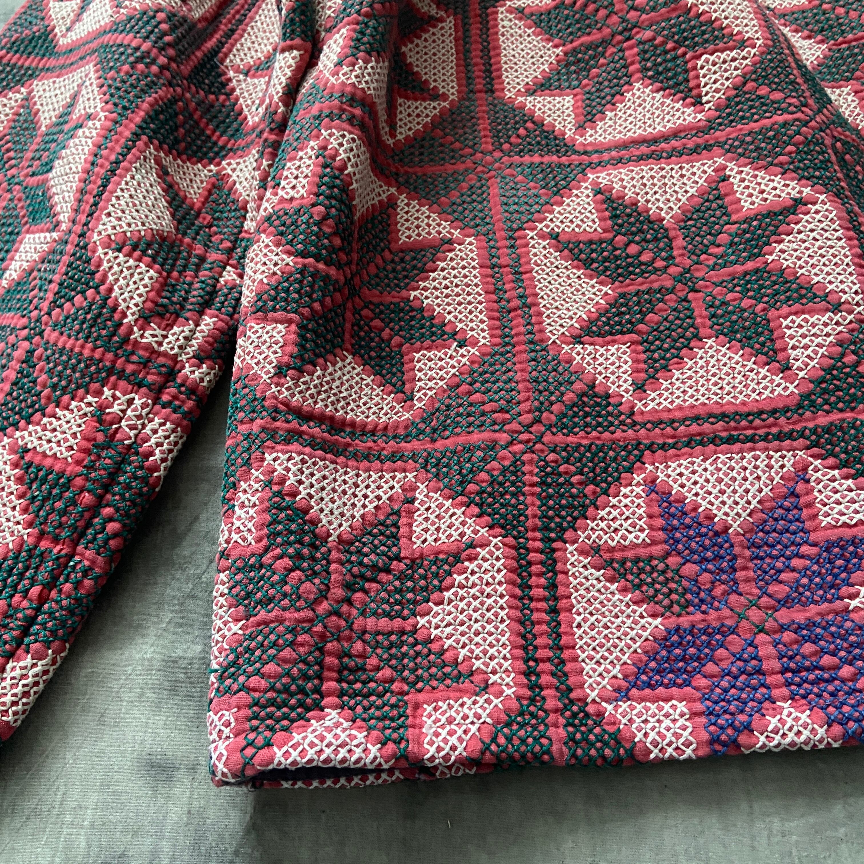 使い古したサリーなどの布を何枚も重ね、細かな刺し子のような刺繍を全面に施して作られます。