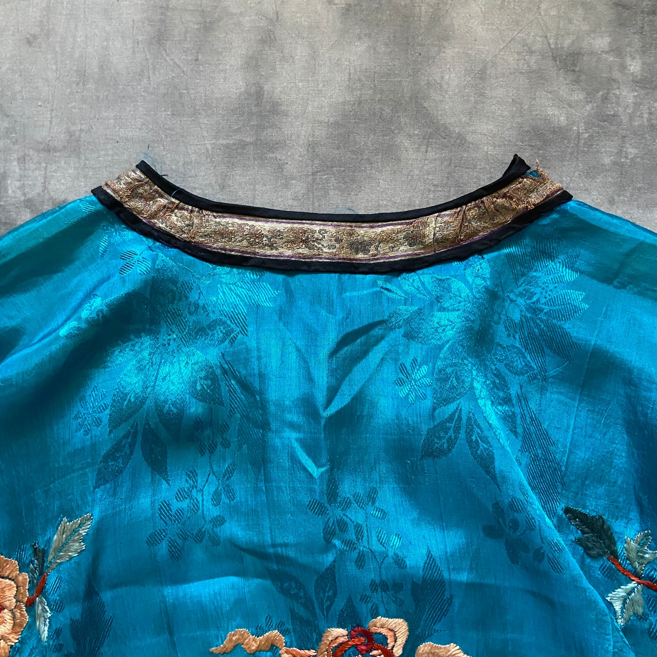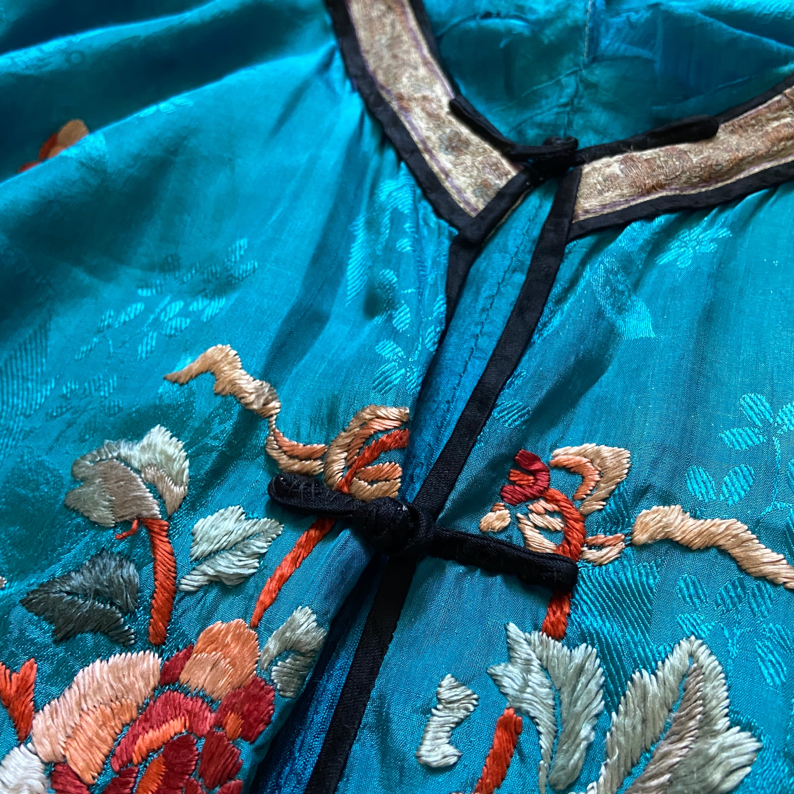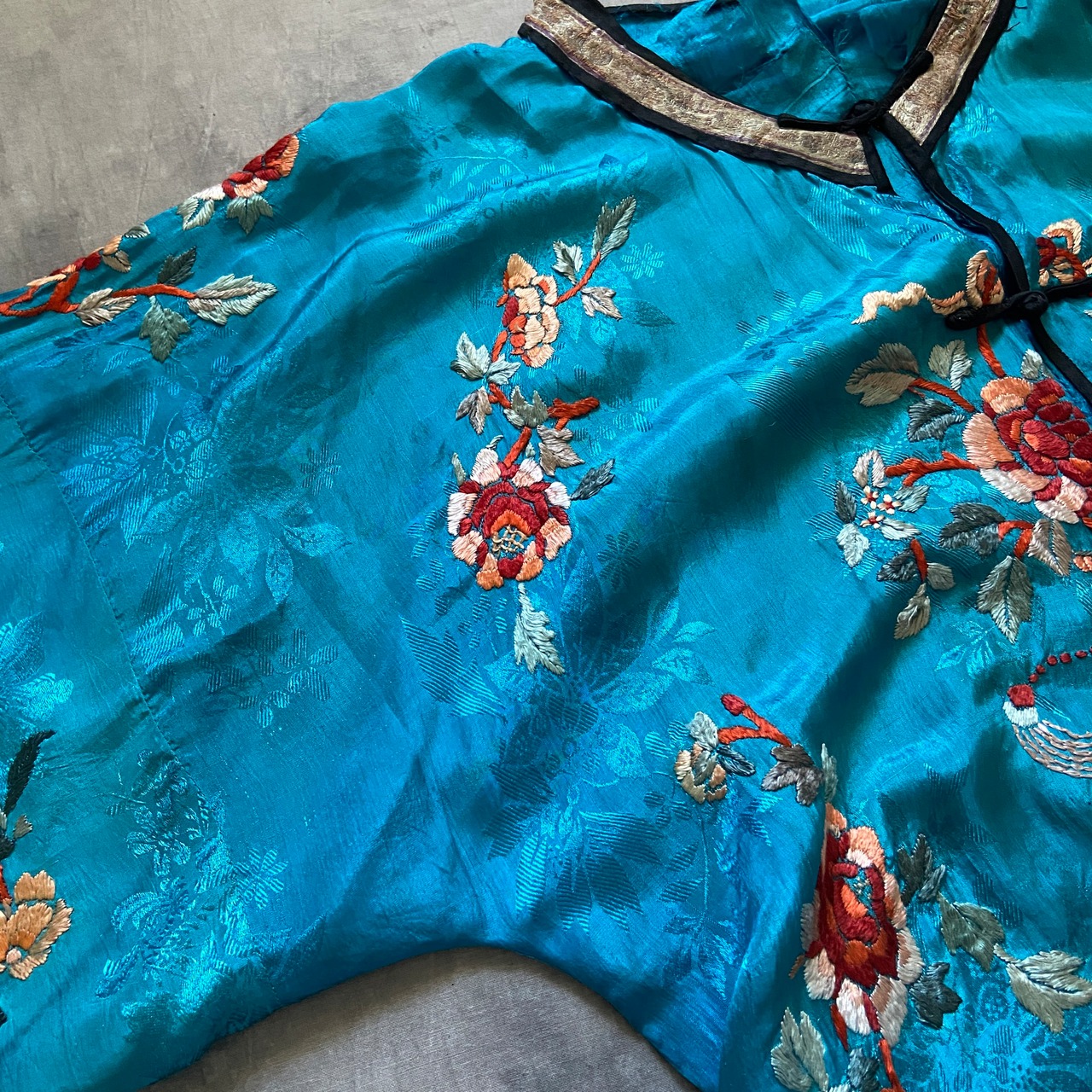 シルクのトロッとした肌馴染みの良さ、細かな織りのテープや袖口の刺繍のグラデーションももはやアート。