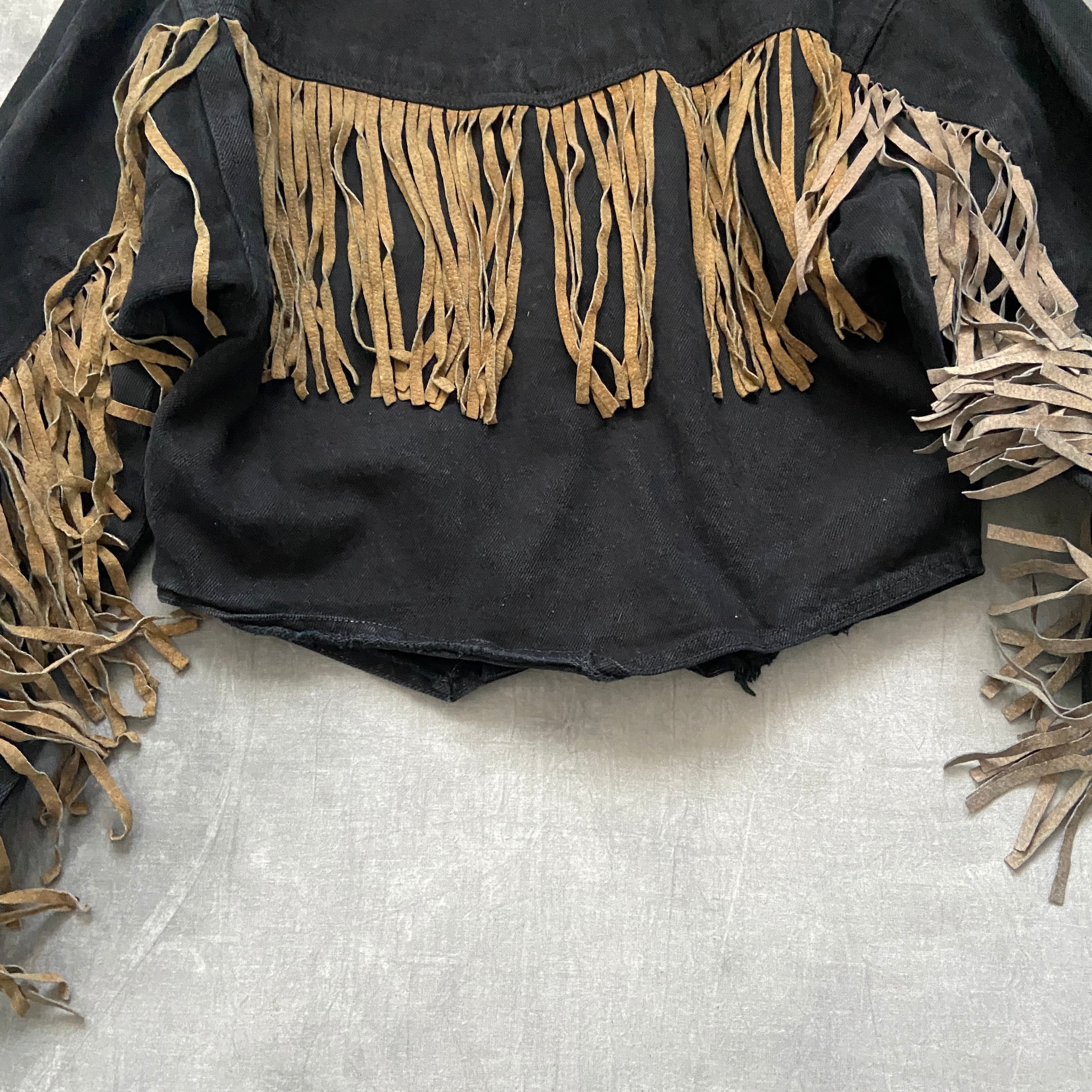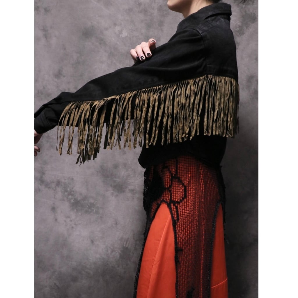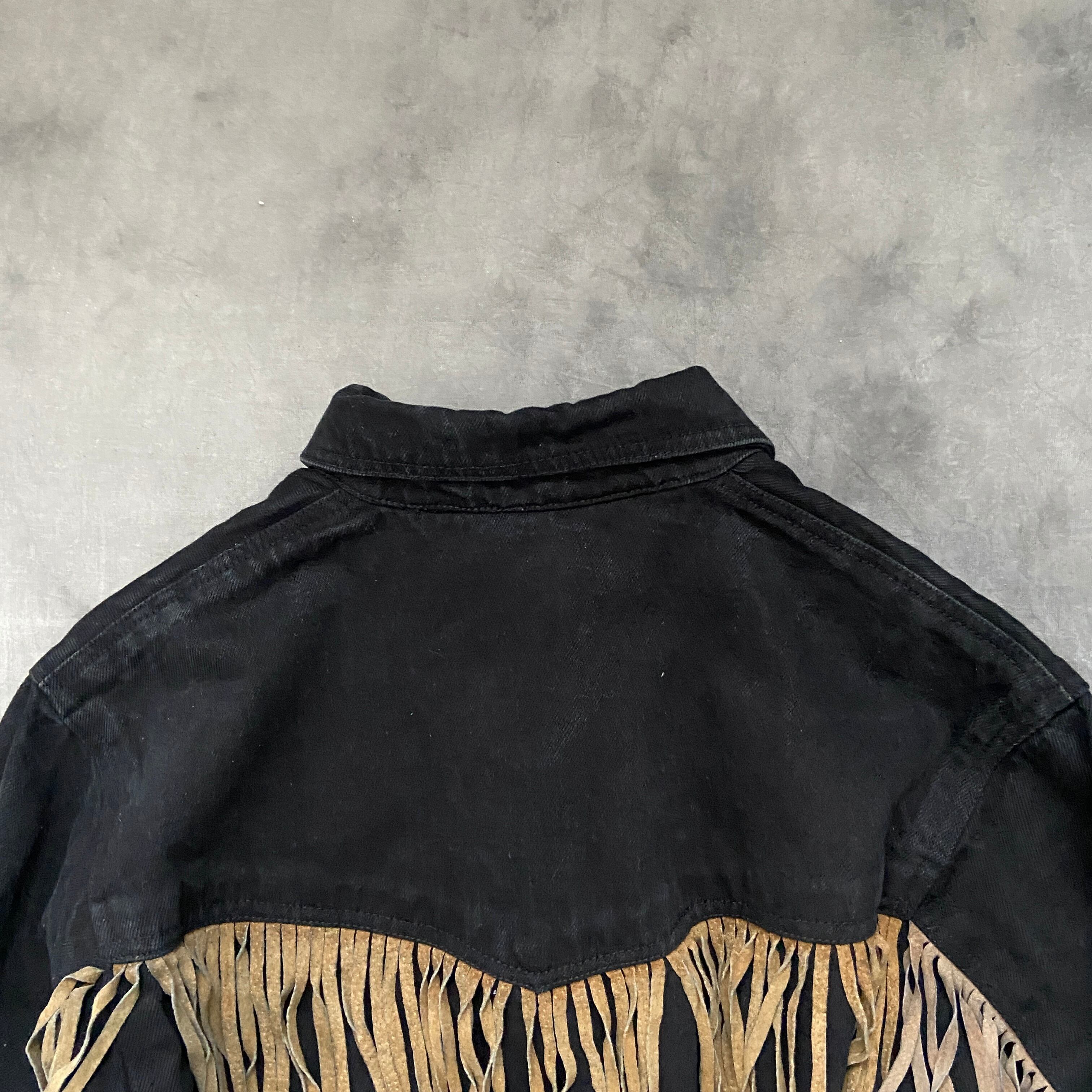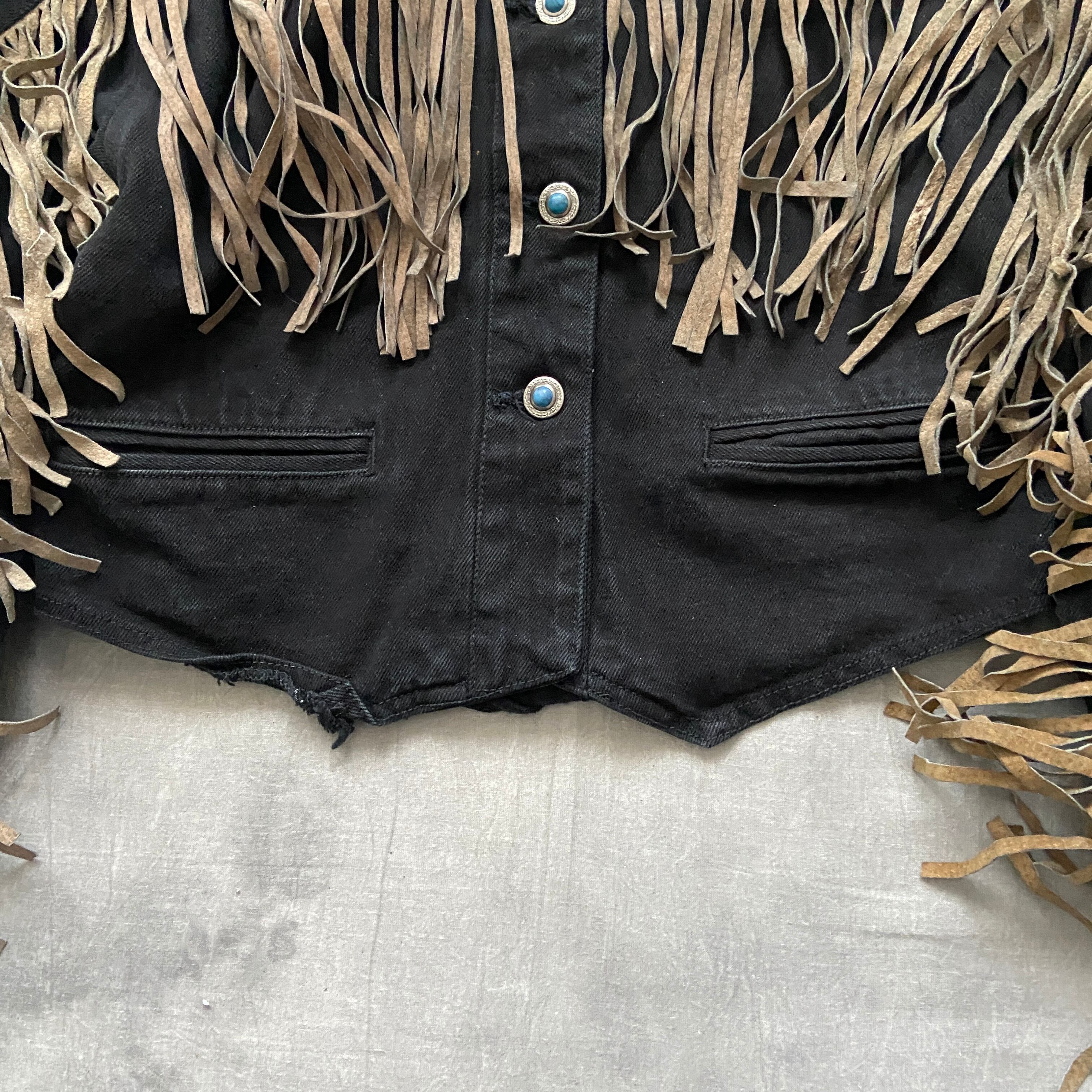 vintage black denim×leather fringe jacket
