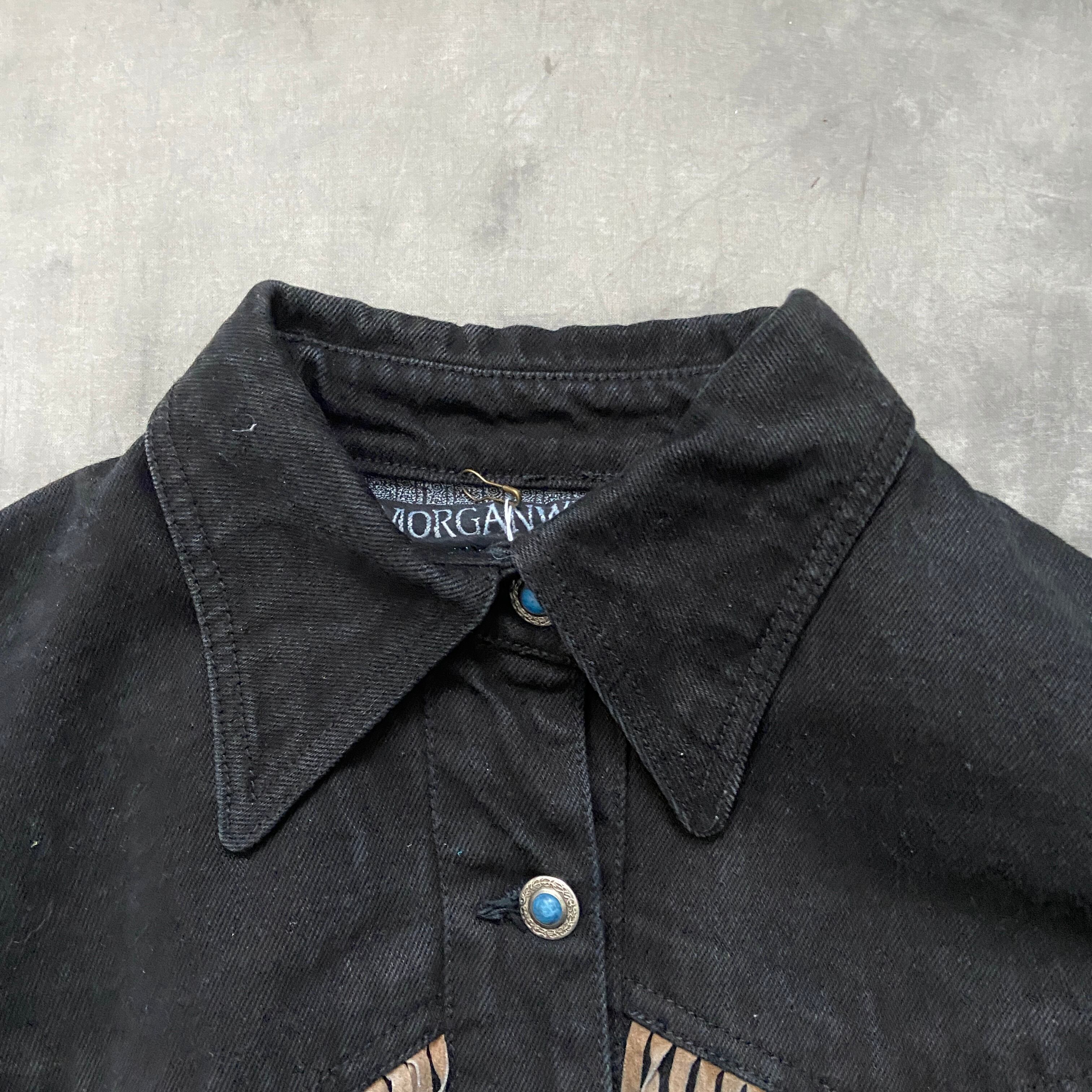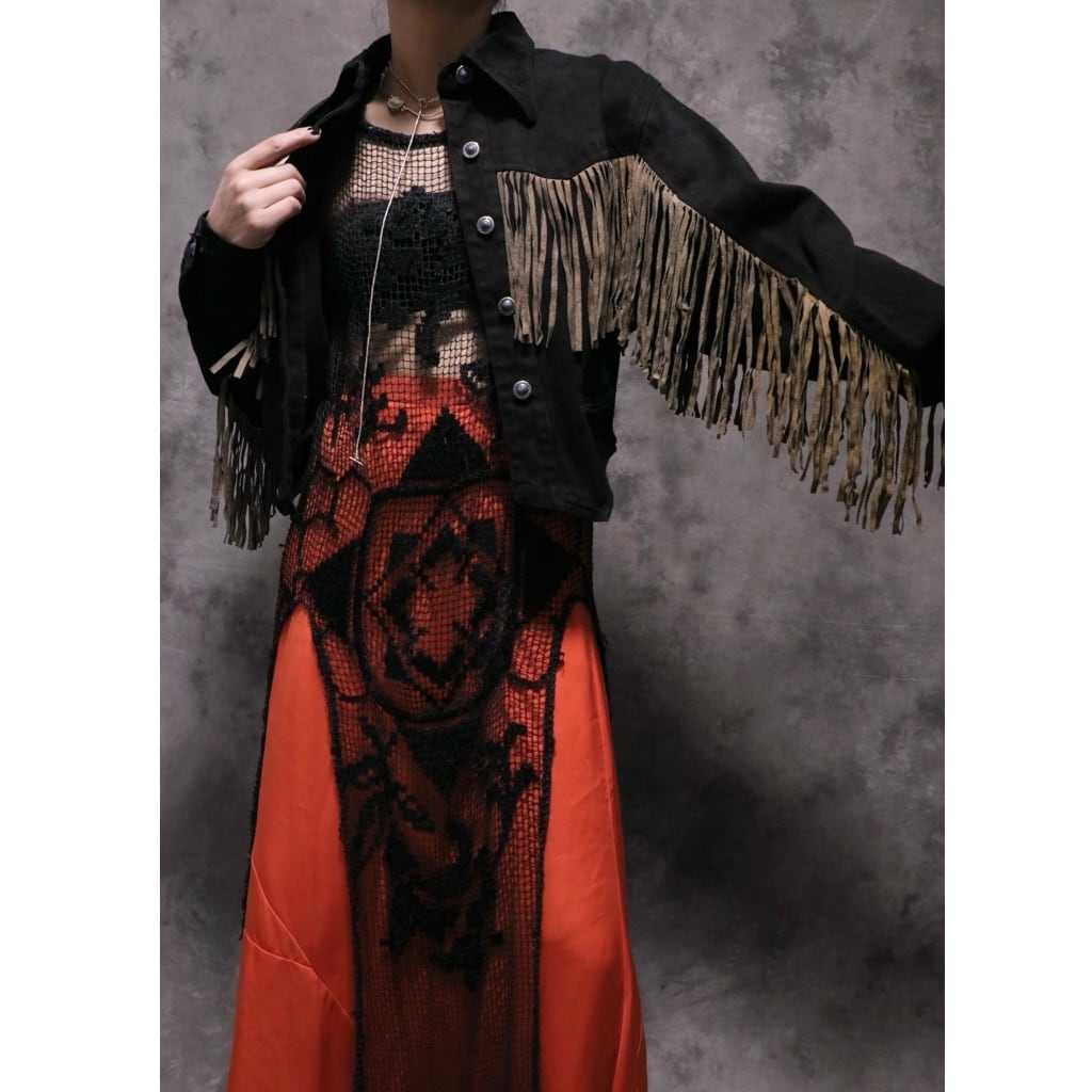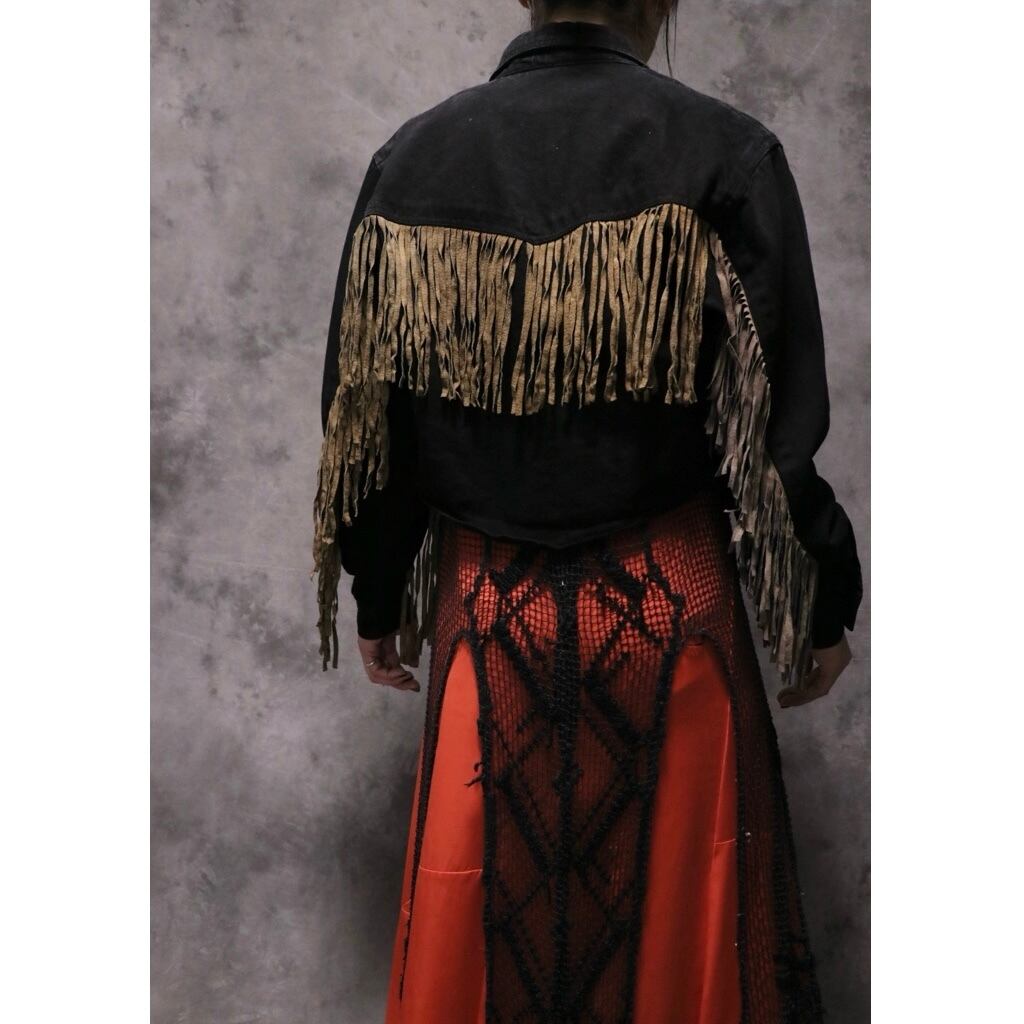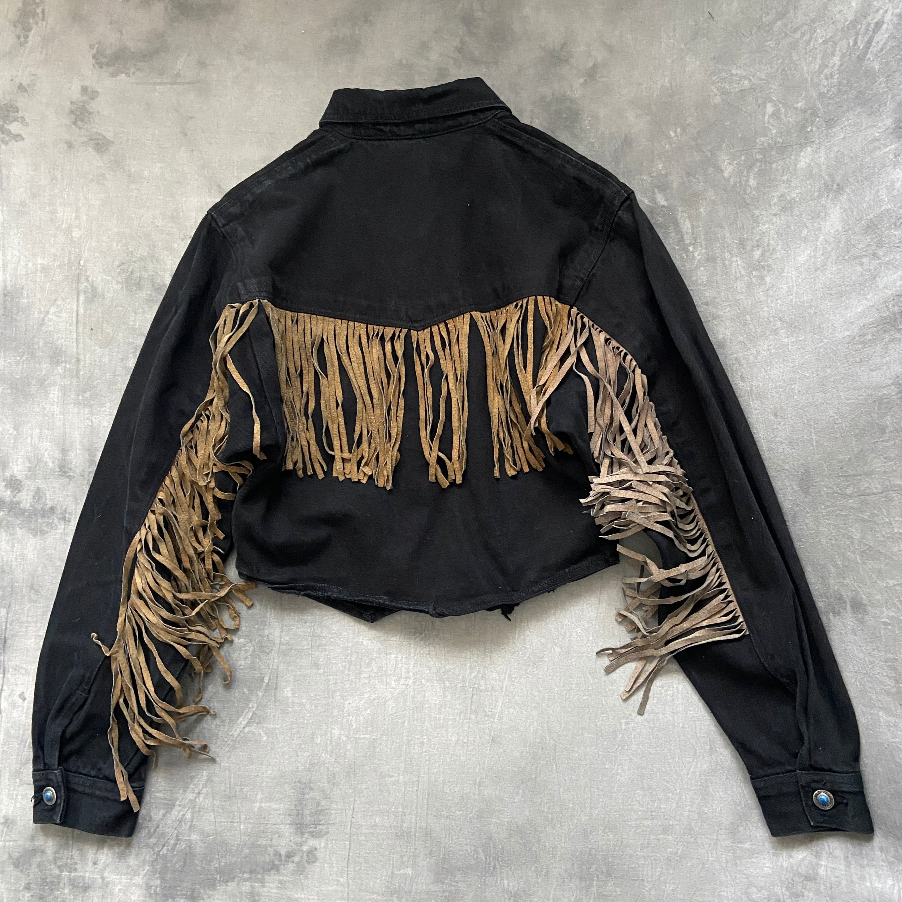 vintage black denim×leather fringe jacket