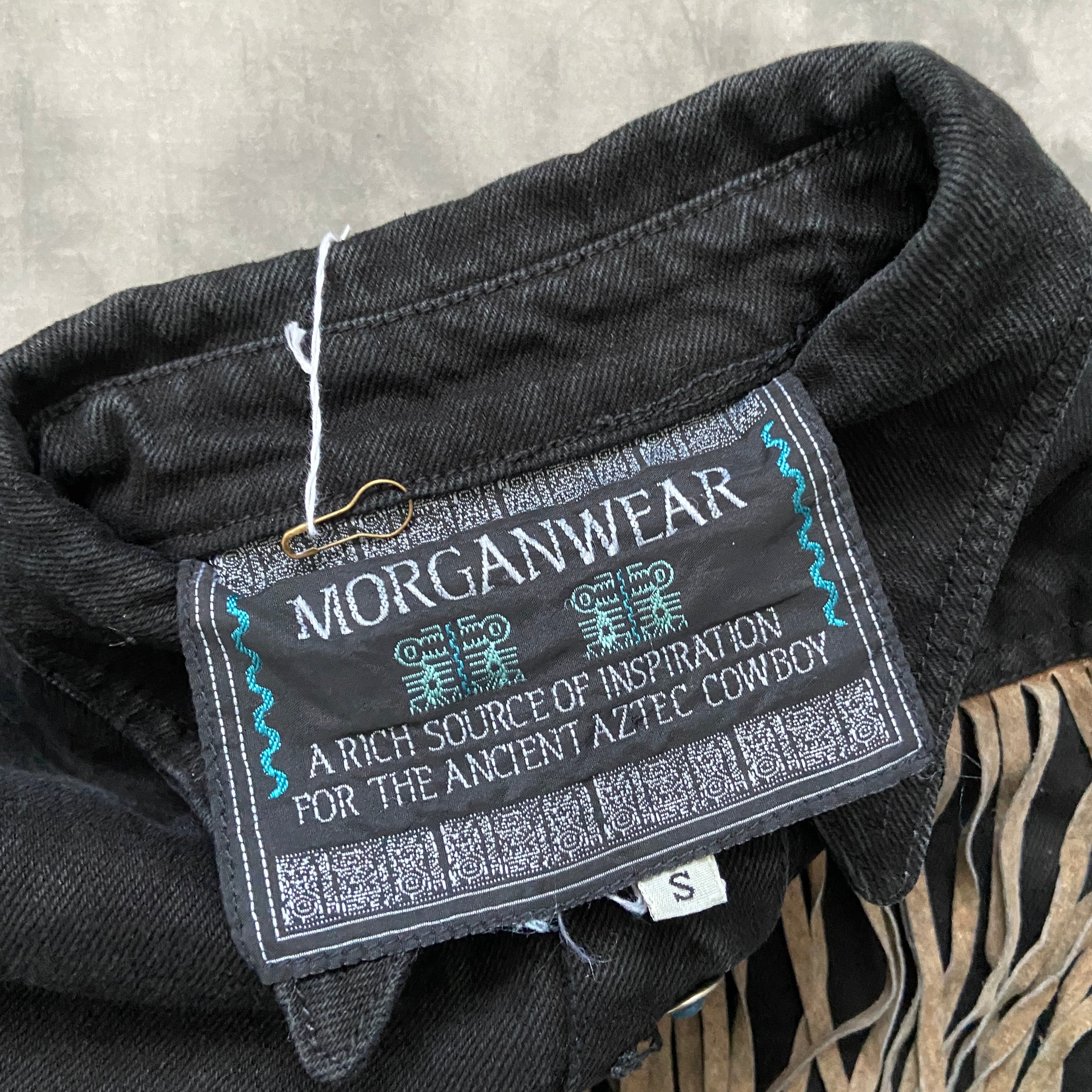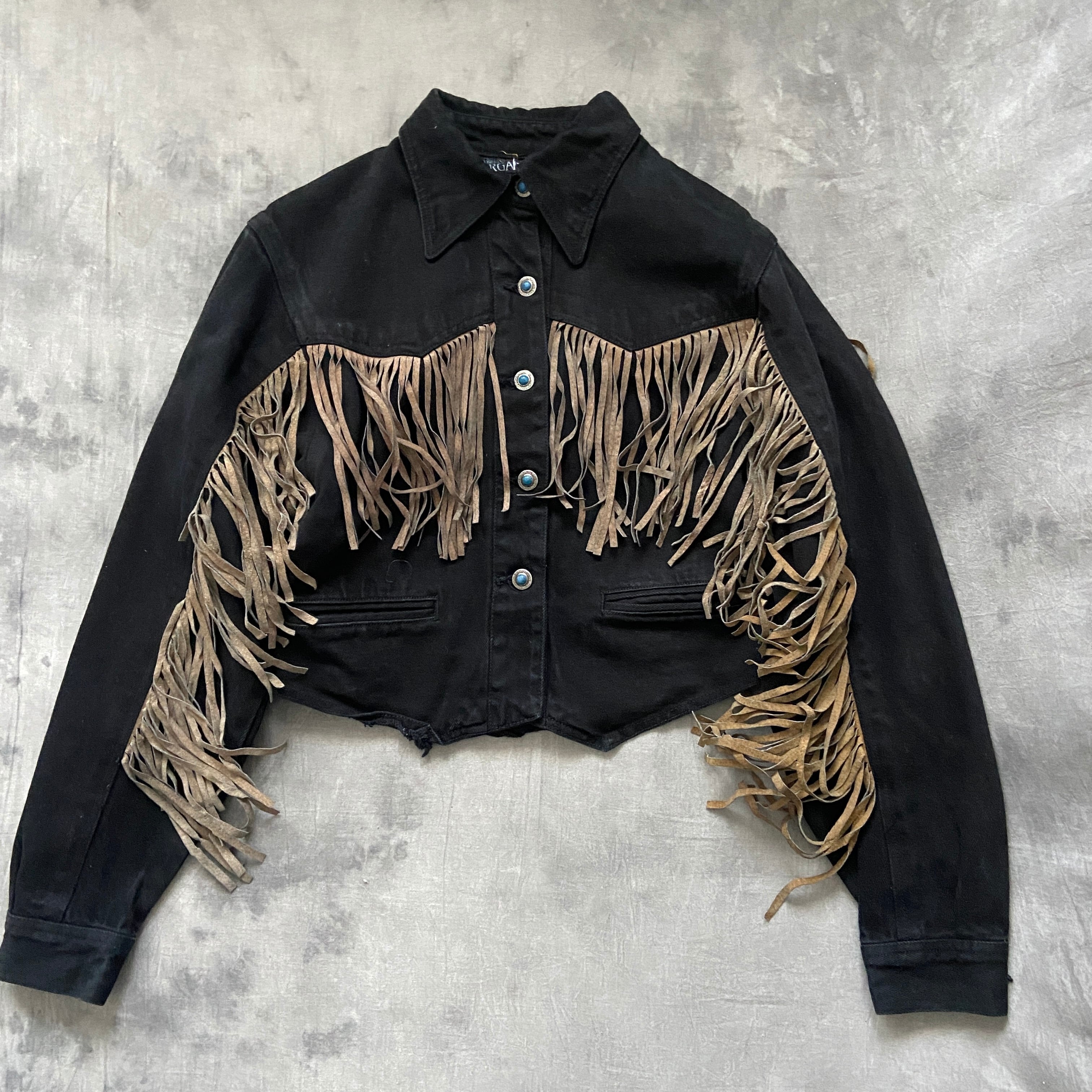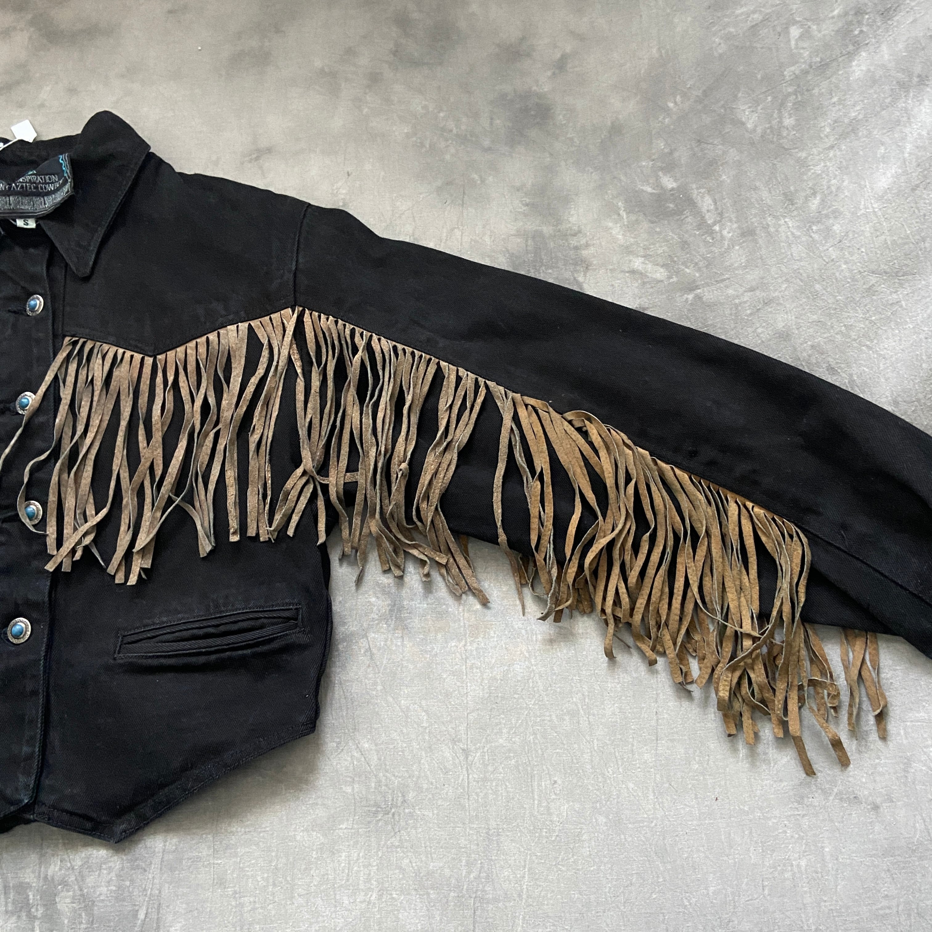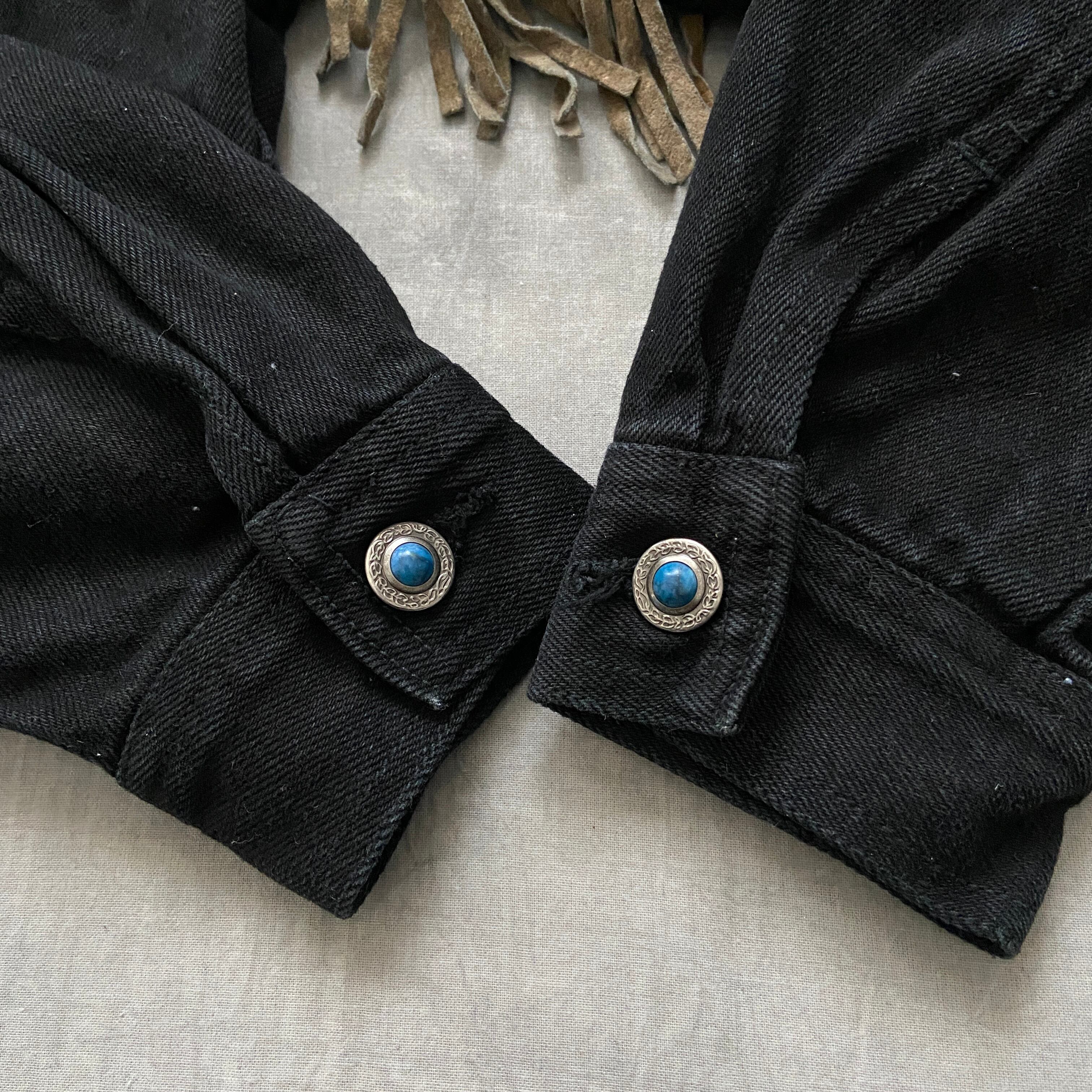 ブラックデニムに贅沢に施されたスエードのフリンジとターコイズのようなかなりデザイン性の高いボタンのデザインが最高。