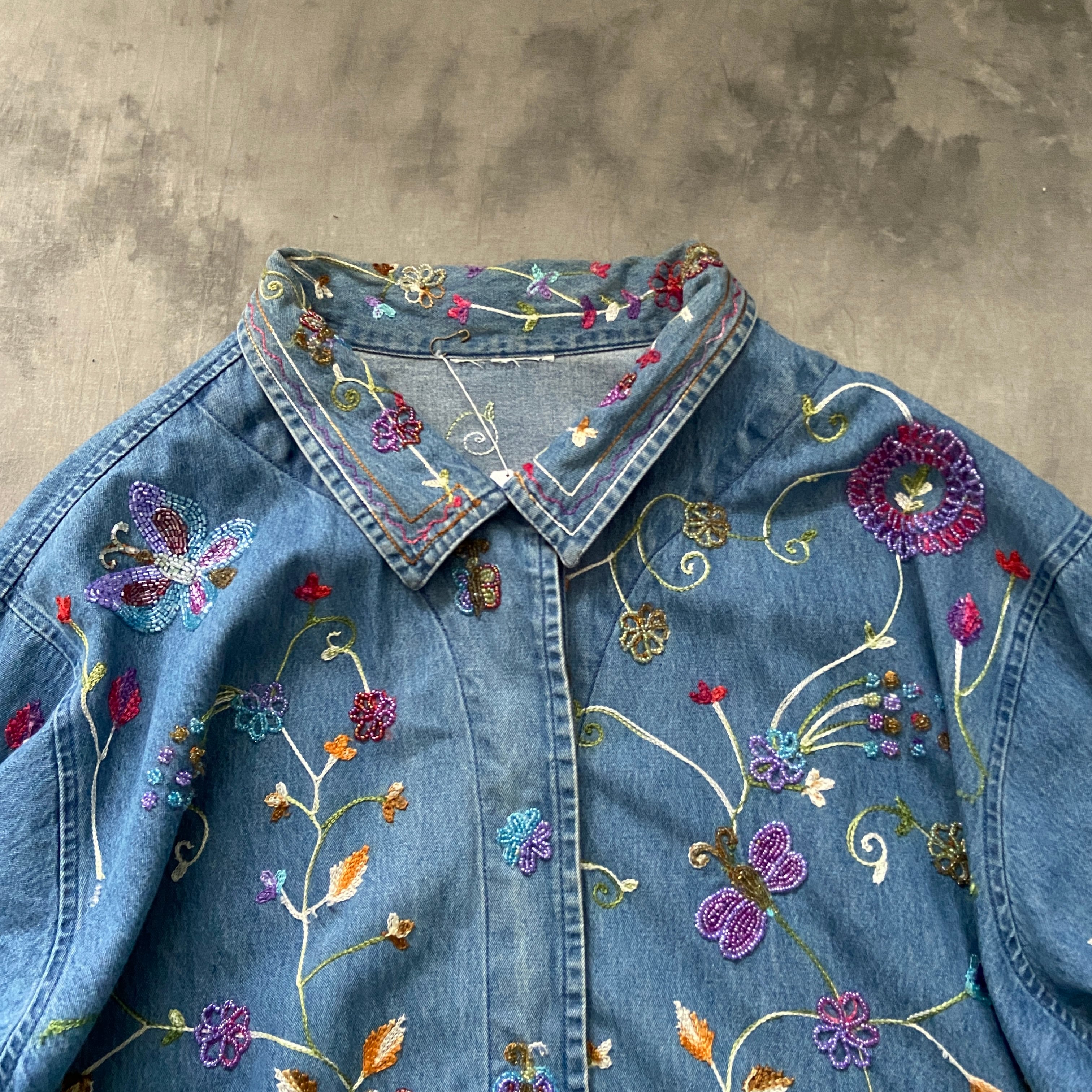 デニムに映える華やかなチェーンステッチと、所々に縫い付けられたビーズが最高すぎます。。。