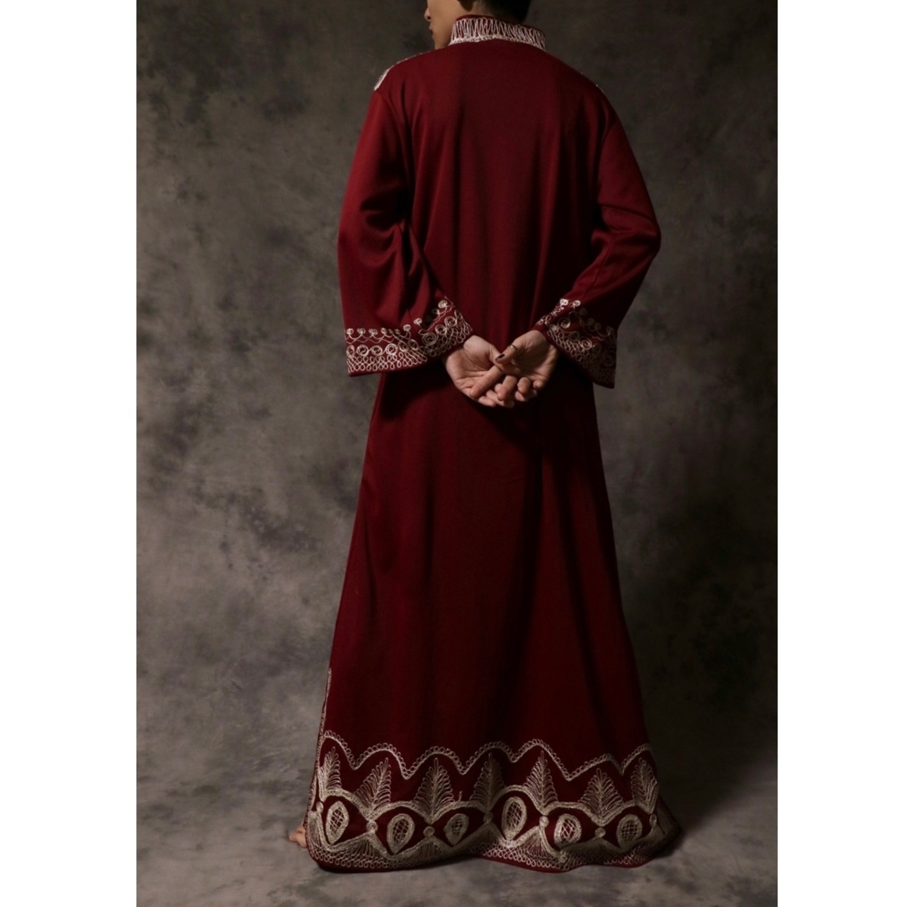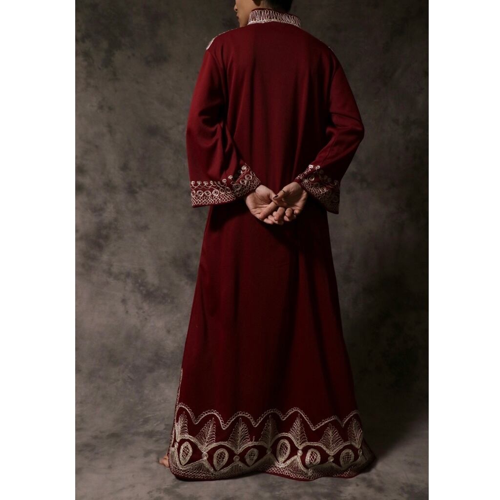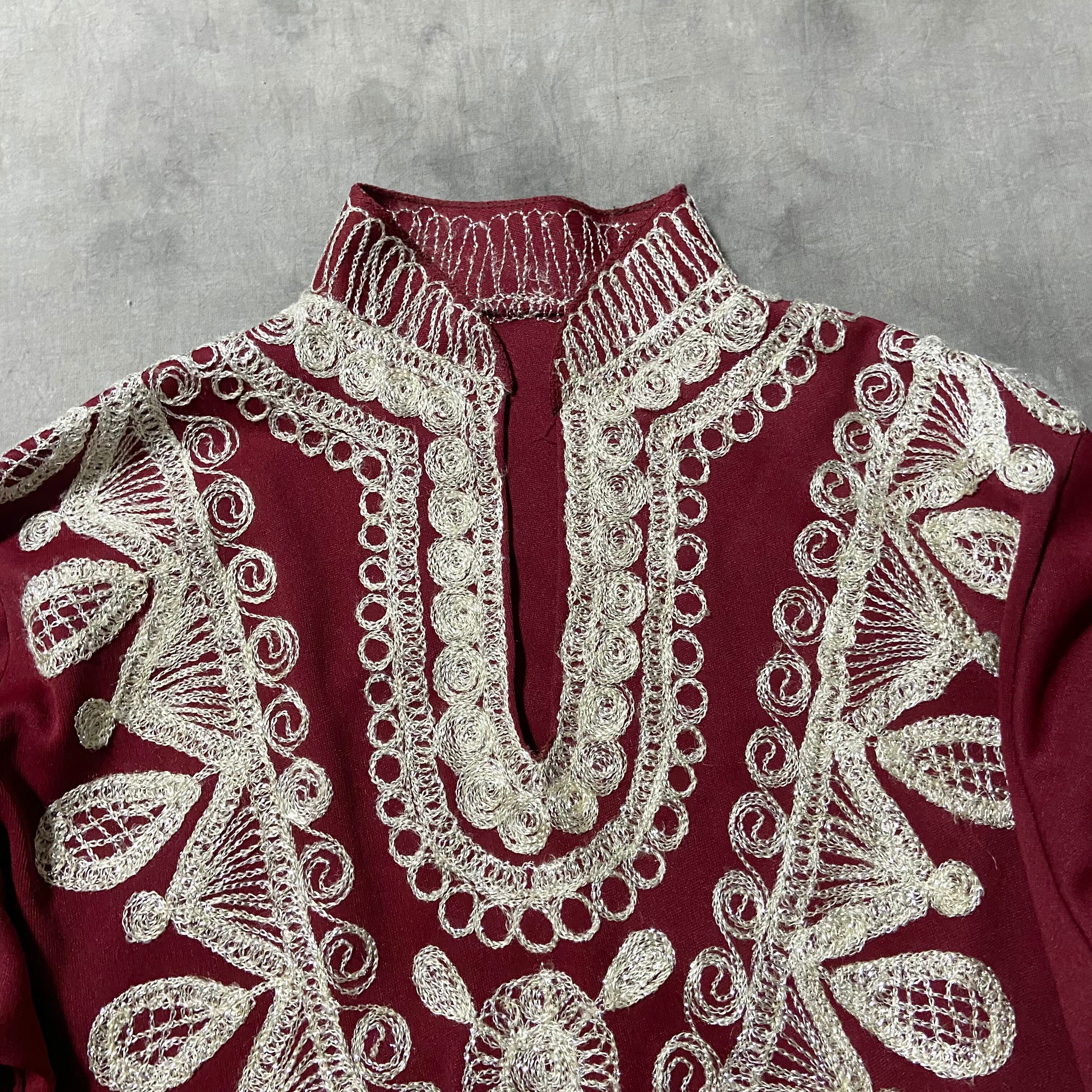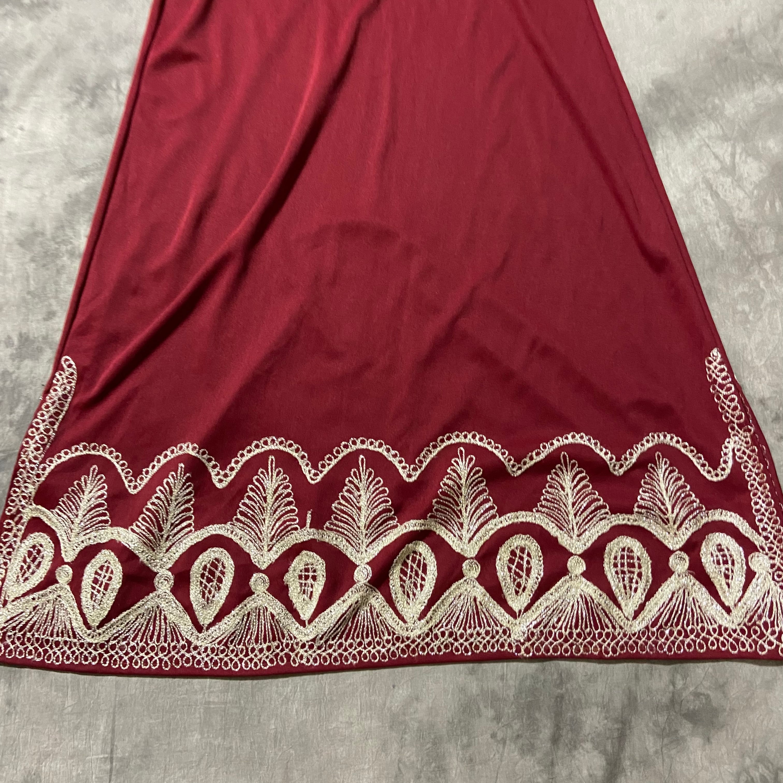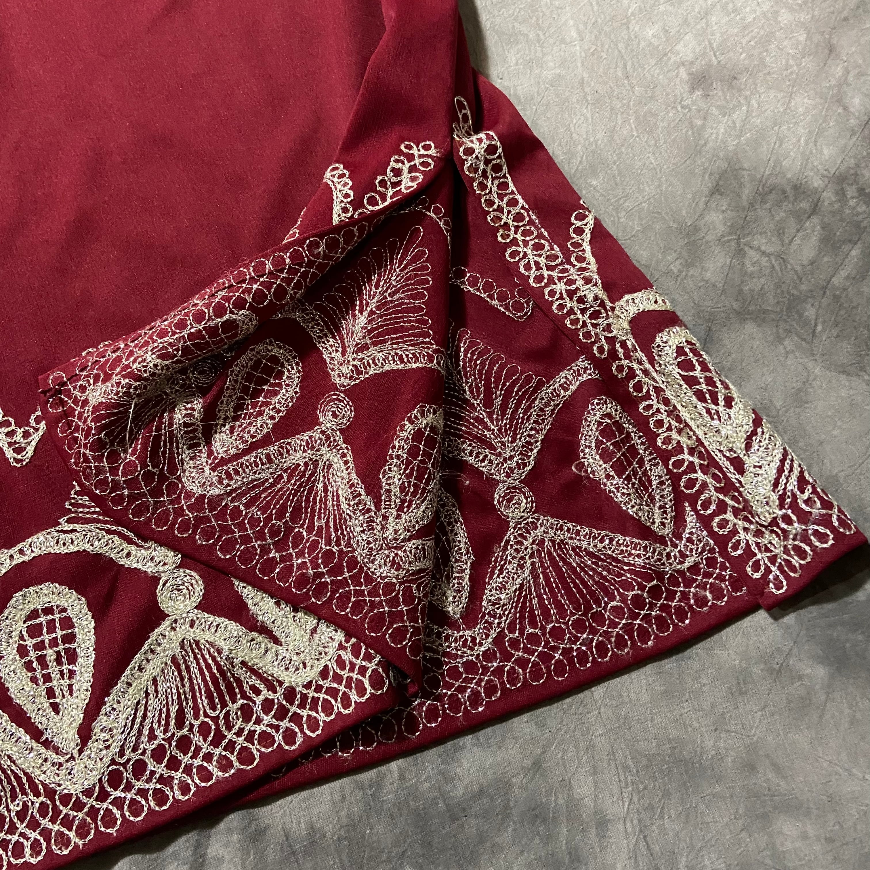 サラッと軽やかなボルドーボディに華やかなチェーンステッチが目を惹く1着。