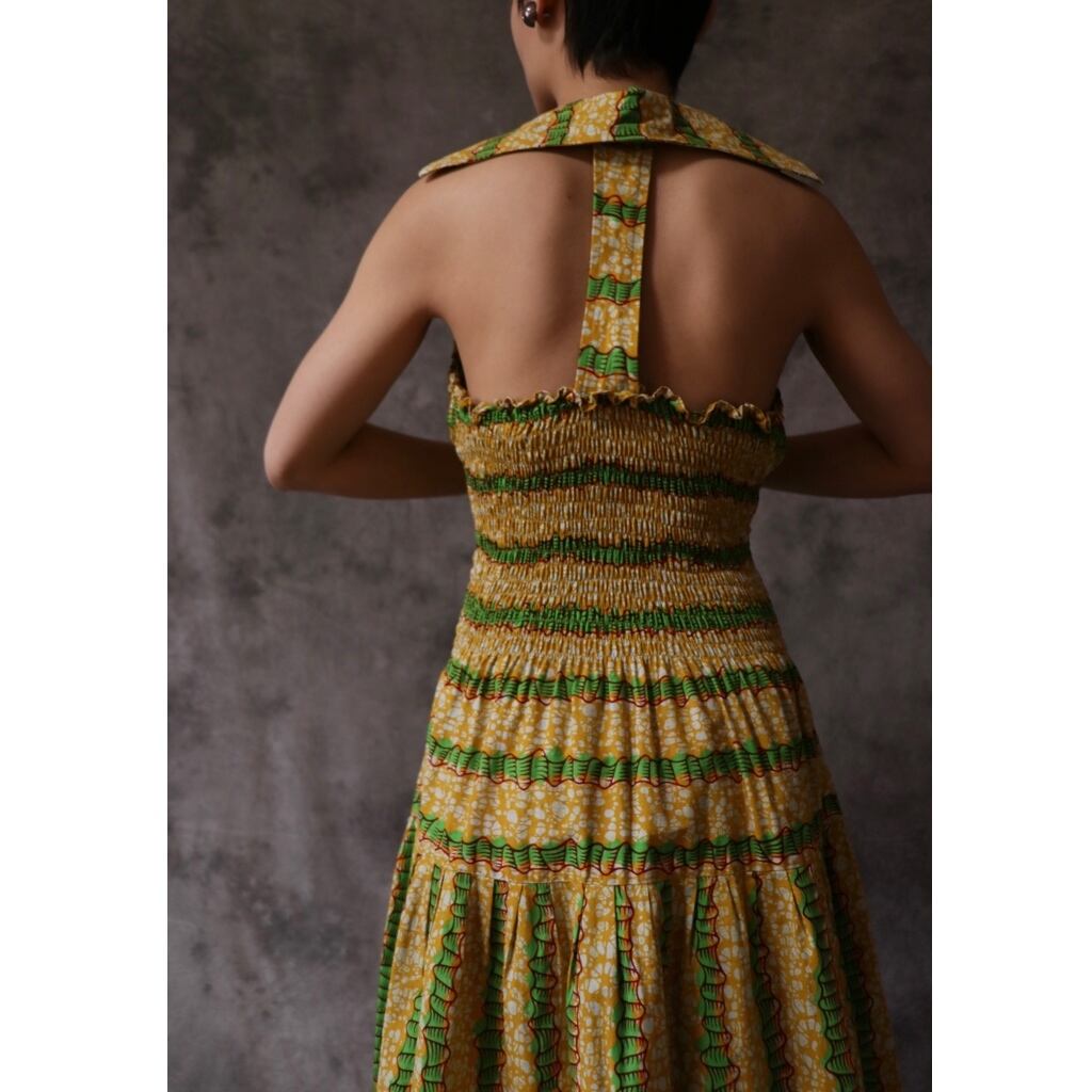 スッキリしたシャーリングのトップにボリューミーなティアードデザインのスカートも綺麗なバランス。