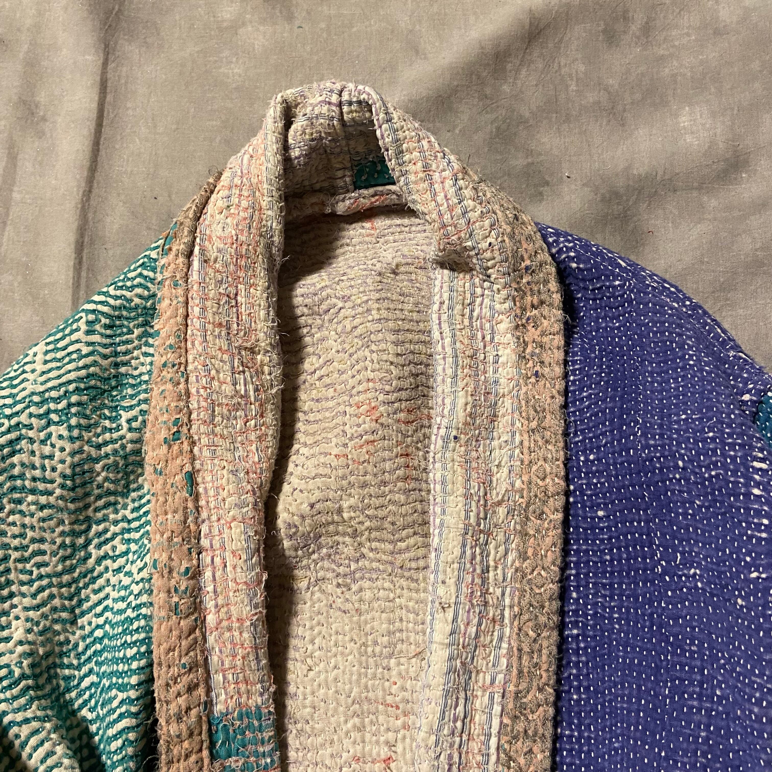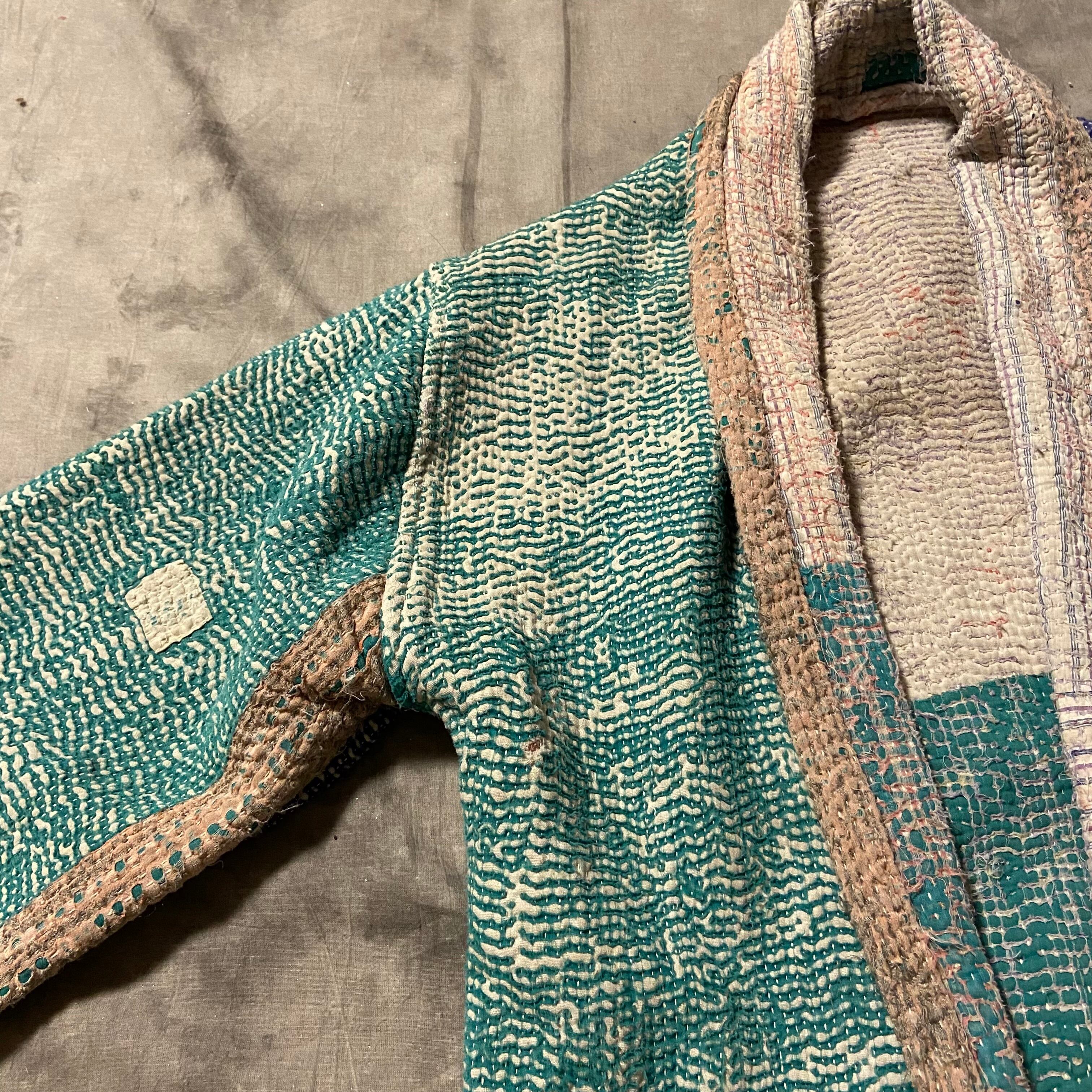 要らなくなったサリー等の布を重ね合わせ、ひと針ひと針丁寧に手作業で刺子を施し新たな1枚の布にしてベッドカバー等に再利用し代々受け継がれています。