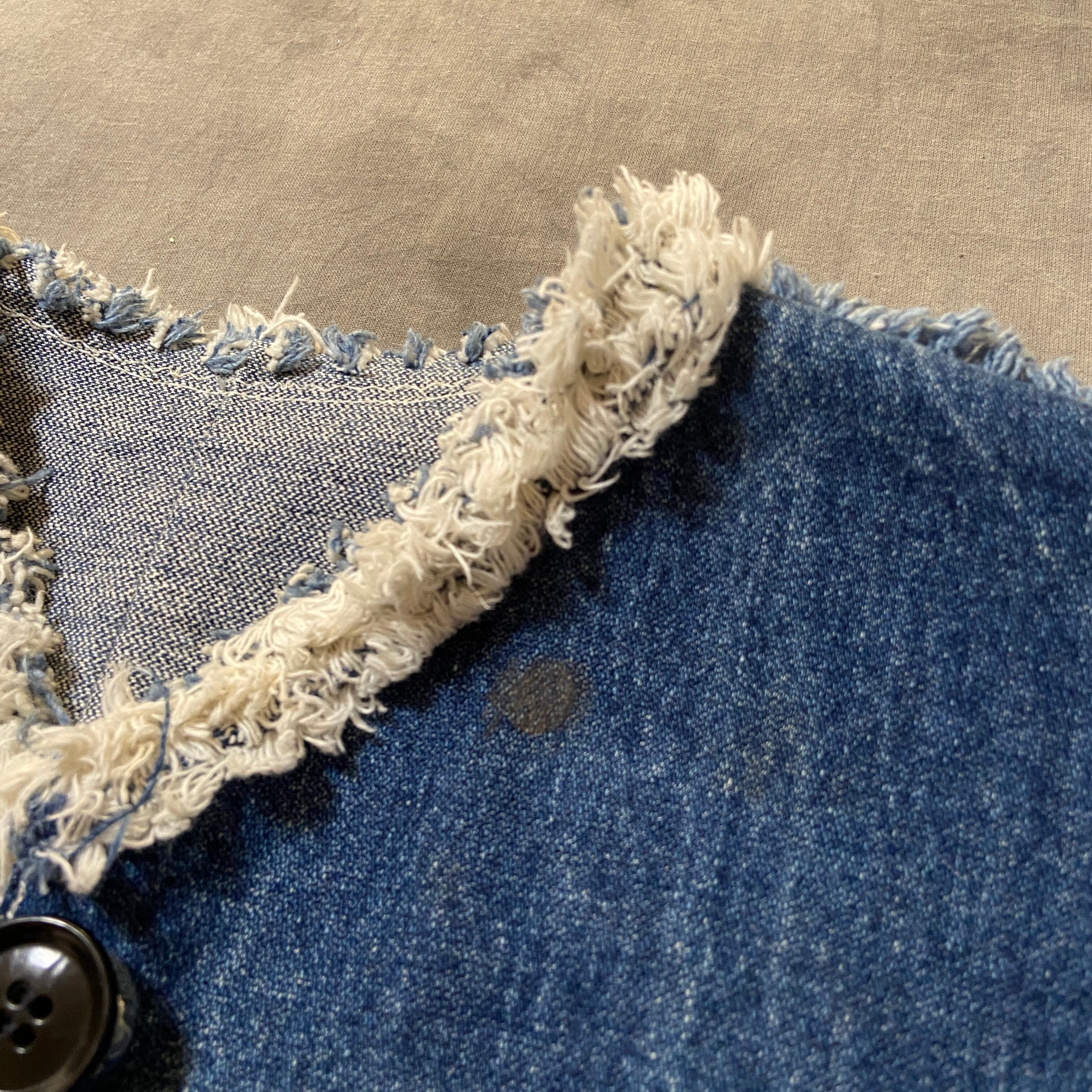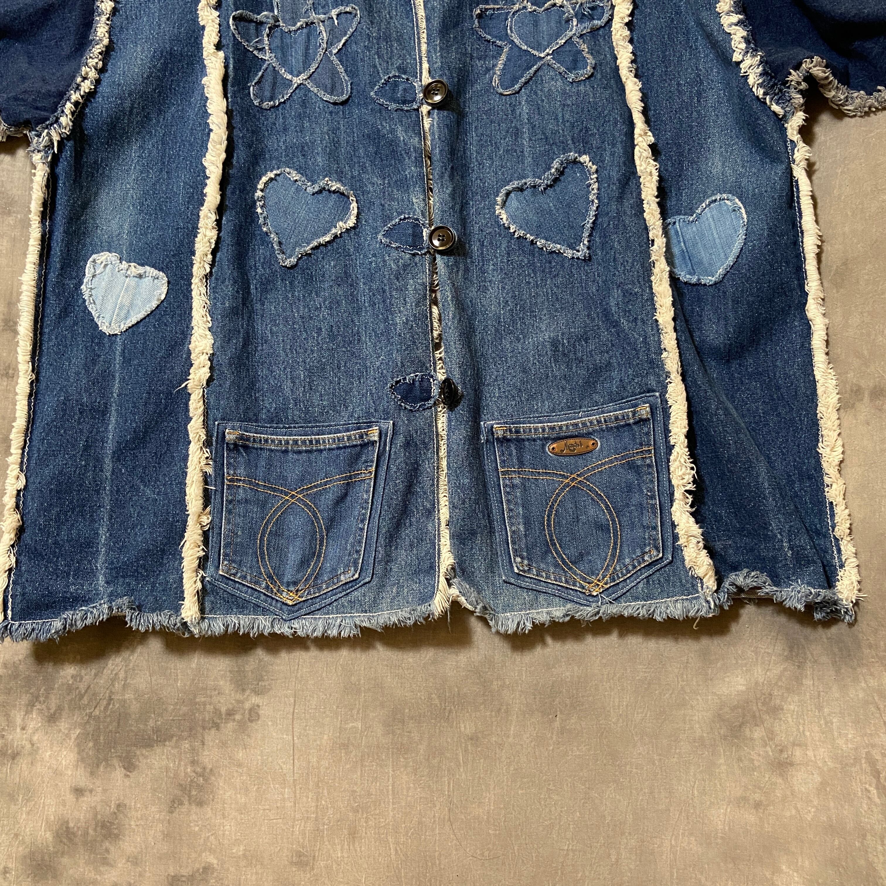 ゆるいハートとお花?のパッチと切りっぱなしのデザインが古着らしさ全開で最高にかわいいです。