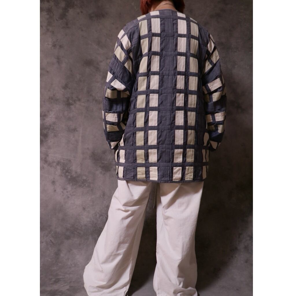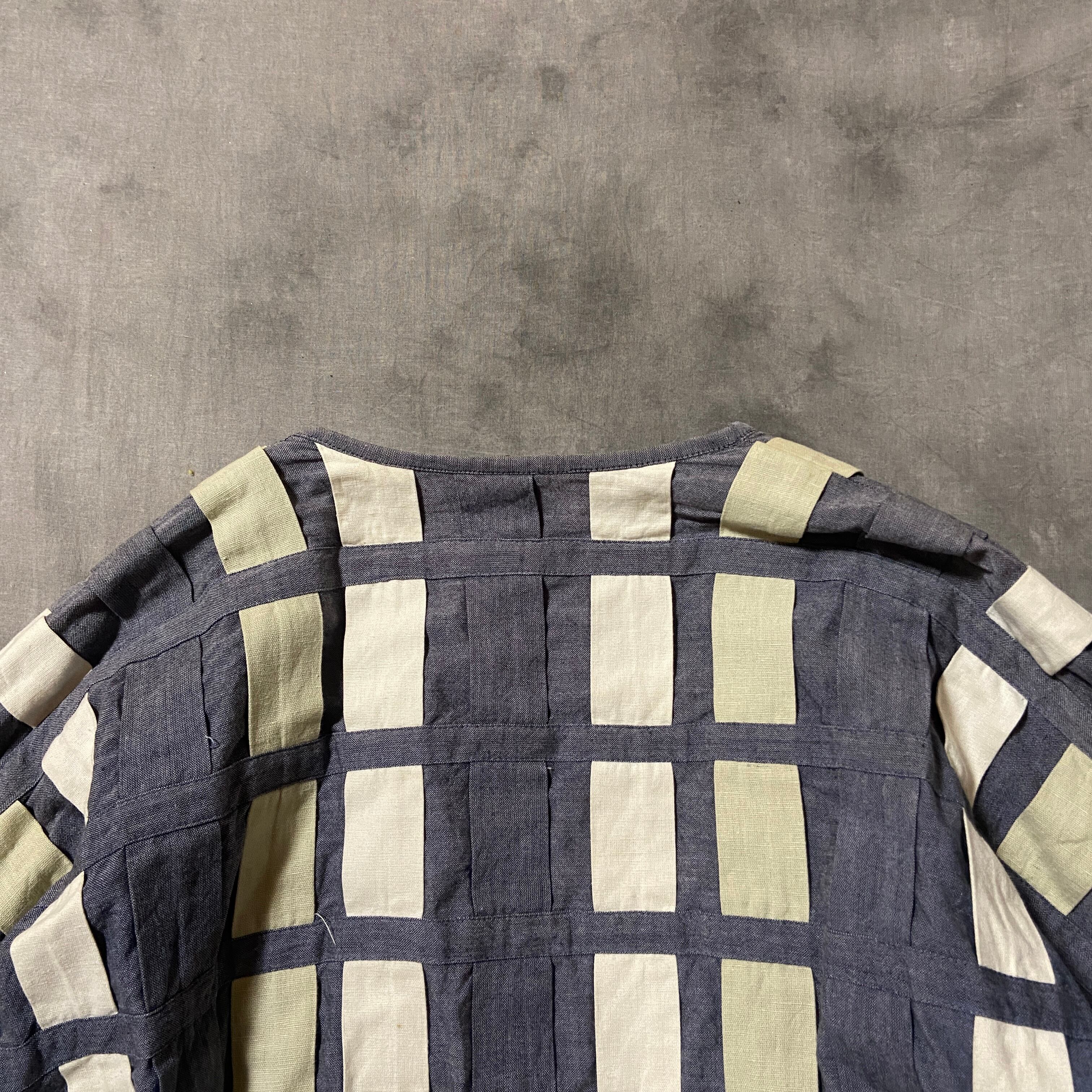 ブルーグレー地に3色の細長い生地が縫い付けられています。
